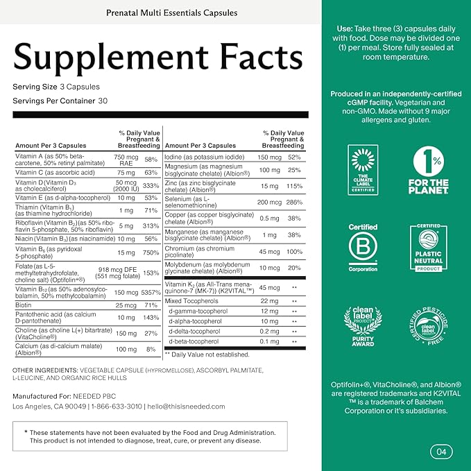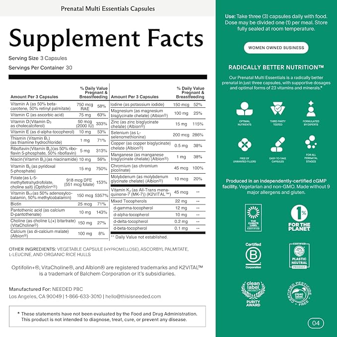 Needed. Multivitamin for Prenatal | Prenatal Multi Essentials Capsule - Pregnancy, Breastfeeding, Postpartum | Expertly-Formulated & Third-Party Tested, Citrus Scent Insert | 30-Day Supply