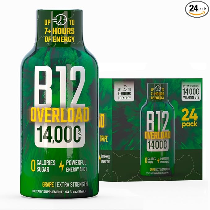 B12 Overload Extra Strength Energy Shot – Grape – 260mg Caffeine, 14000% B12, Electrolytes – Energy & Vitality Support – Zero Sugar No Calories – Vegan, Kosher, Gluten-Free – 1.93 fl oz, 24 -Pack