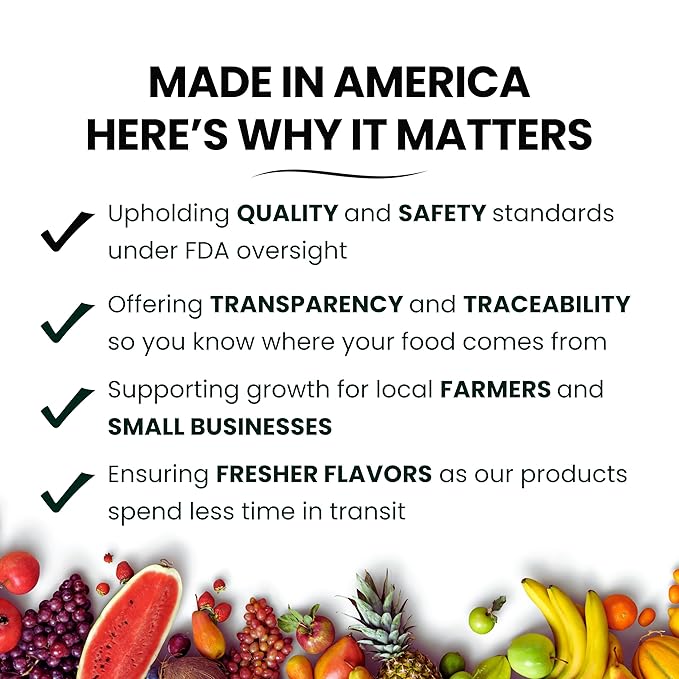 - MADE IN THE USA: Our products uphold stringent quality standards overseen by the FDA, ensuring transparency and support for local economies while delivering fresher flavors with shorter transit times.