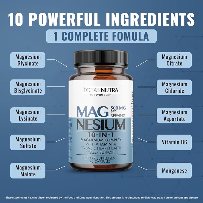10-in-1 Magnesium Supplement 500 mg | High Absorption Magnesium Complex with Mag Glycinate, Citrate, Vitamin B6 Magnesium for Sleep, Muscle, Bone & Heart Health, Vegan & Gluten-Free, 45 Day Supply