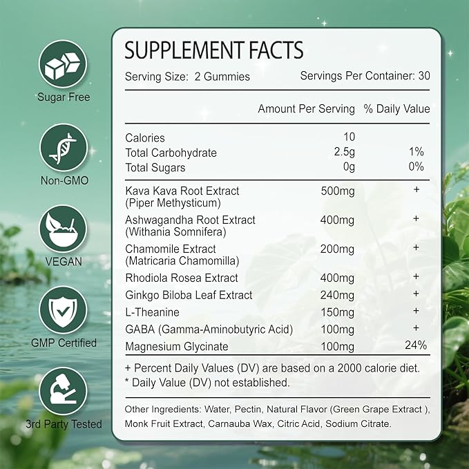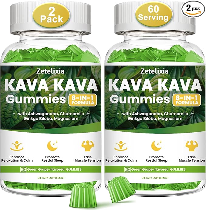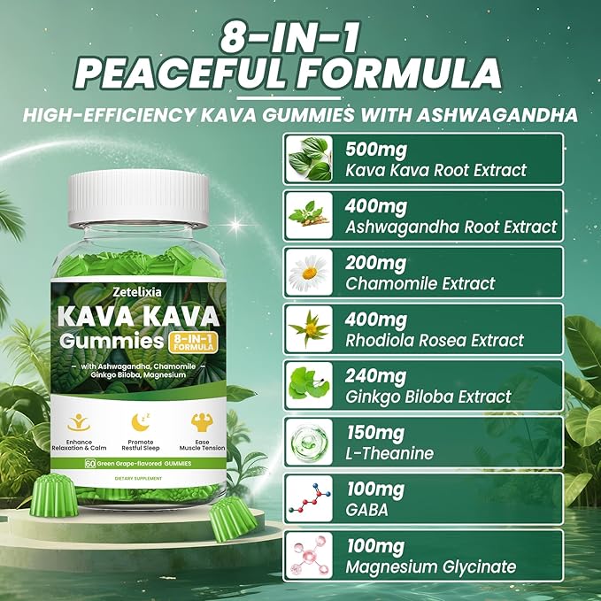 - 8-IN-1 Peaceful Formula: A premium blend of KAVA ROOT EXTRACT WITH KAVALACTONE (natural stress relief), adaptogens (Ashwagandha/Rhodiola) for energy, Ginkgo biloba for focus, Chamomile + L-Theanine for calm, and GABA + magnesium for deep relaxation. Combines science-backed ingredients to melt stress, boost cognitive clarity, and restore mind-body balance—all in a tasty gummy