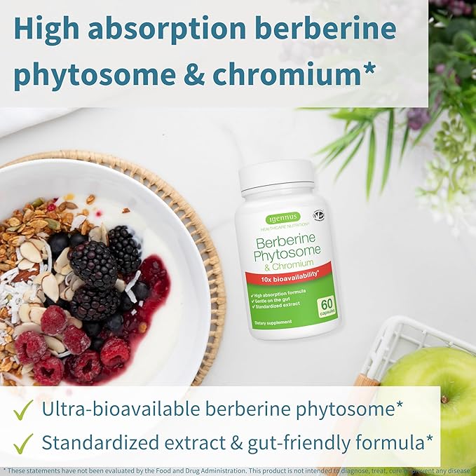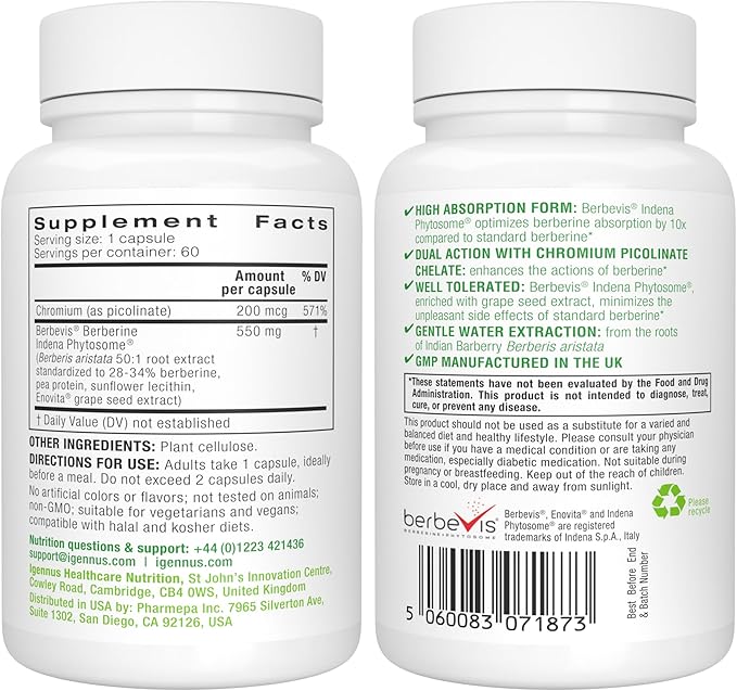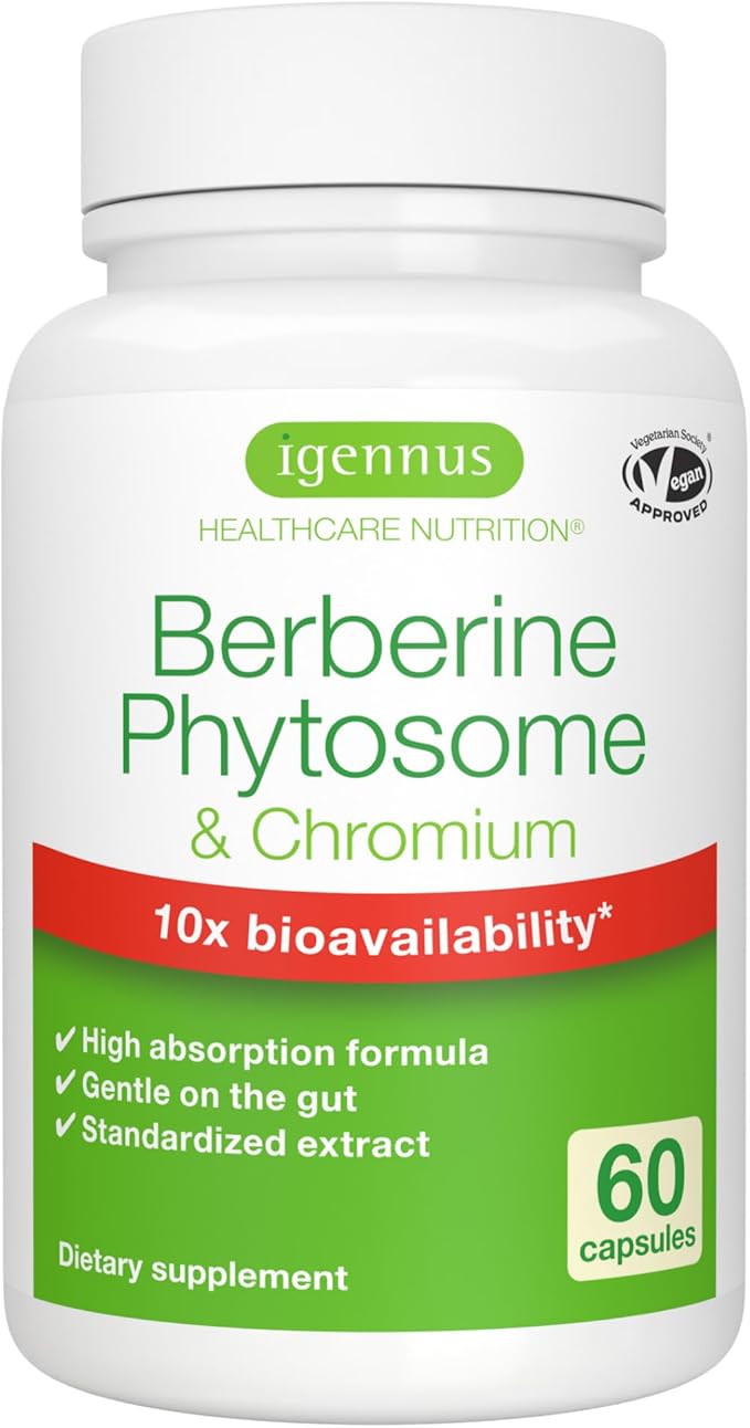 Igennus Dual Action Berberine Phytosome 550mg & Chromium Picolinate, 10x Absorption, Blood Glucose Control, Standardized Berberis Extract Supplement, Clean Label, Vegan, 60 Capsules