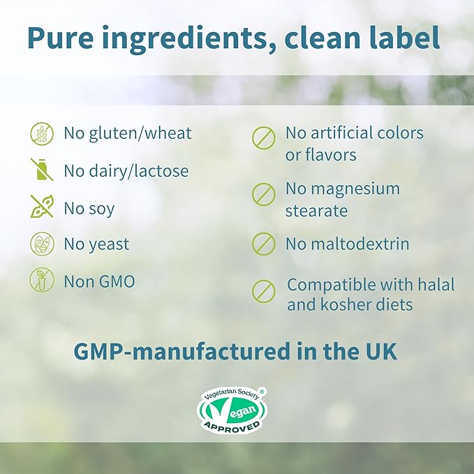 - PURE & CLEAN - we only use hypoallergenic and lab verified ingredients, with no unnecessary additives (such as magnesium stearate), vegan, GMP-manufactured in the UK