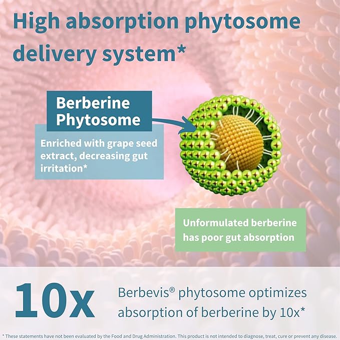 - 10x ABSORPTION PHYTOSOME FORM - with a unique 100% food-grade matrix based on lecithin to enhance solubility, Berbevis Berberine Phytosome optimizes absorption by 10x compared to standard berberine*