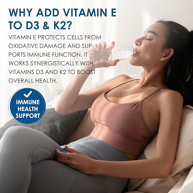 - WHY ADD VITAMIN E TO D3 K2?: Vitamin E helps protect cells from oxidative damage, supporting optimal immune function. Combined with vitamin d3 k2, it strengthens your immune system, creating a powerful defense against pathogens and boosting your energy for overall wellness.