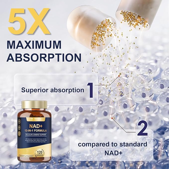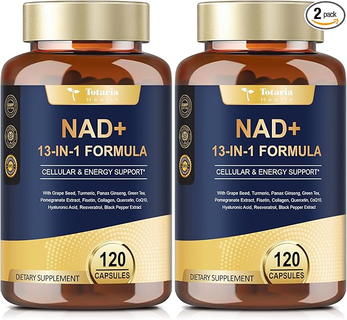 - POWERHOUSE BLEND OF NATURAL INGREDIENTS: Discover the ultimate synergy of 13 scientifically selected natural extracts in our NAD supplement capsules. Each serving is a potent fusion of Grape Seed, Turmeric, Panax Ginseng, Green Tea, Pomegranate Extract, Fisetin, Collagen, Quercetin, CoQ10, Hyaluronic Acid, Resveratrol, and Black Pepper Extract. This comprehensive formula supports cellular health, immune function, and promotes radiant skin, making it the ultimate choice for a holistic wellness approach.