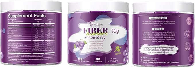 - Delicious and Convenient: Our probiotic fiber gummies are made with natural sweetener(FOS) , which are plant-based low-calorie sweetener that won't cause cavities. Delicious Grape Flavors-Say goodbye to hard-to-swallow capsules and powders.