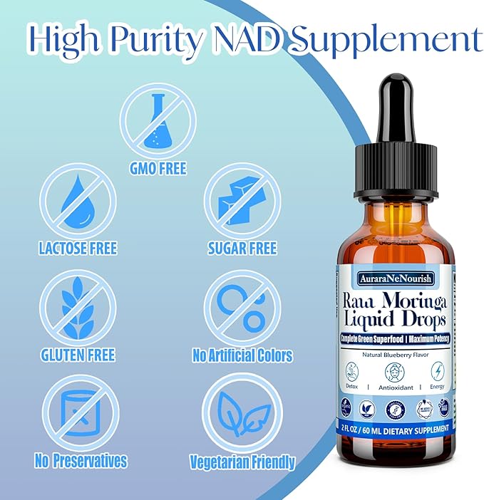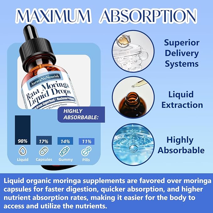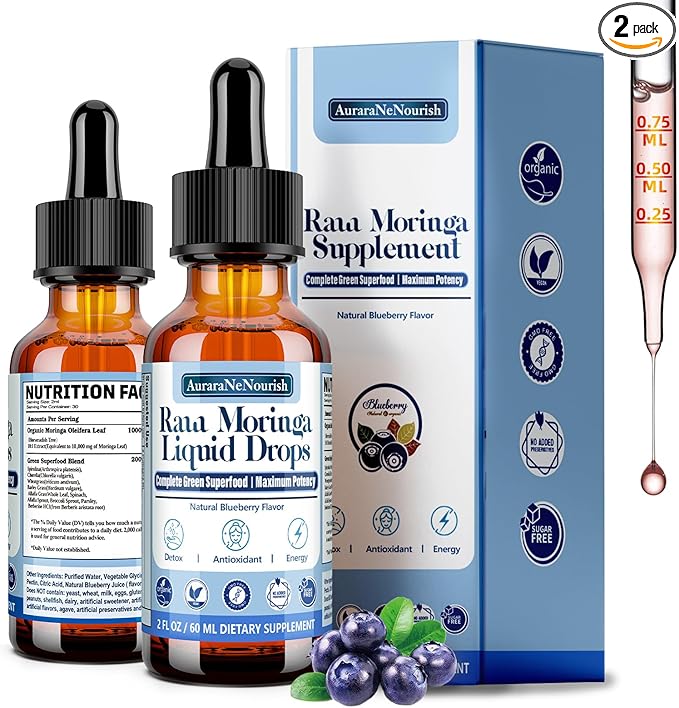 - Easy-to-use Liquid Form for Maximum Absorption: Our raw moringa organic supplement drops comes in a convenient liquid form, offering superior absorption compared to traditional moringa capsules, moringa gummies, and moringa powders. Simply mix 2 droppers with water, smoothies, or take it sublingually instead of swallowing moringa capsules, moringa pills, or moringa powders. Natural blueberry flavor makes it a pleasure to take daily. Each 60ml bottle provides a 30-day supply, making it a reliable choice for long-term use