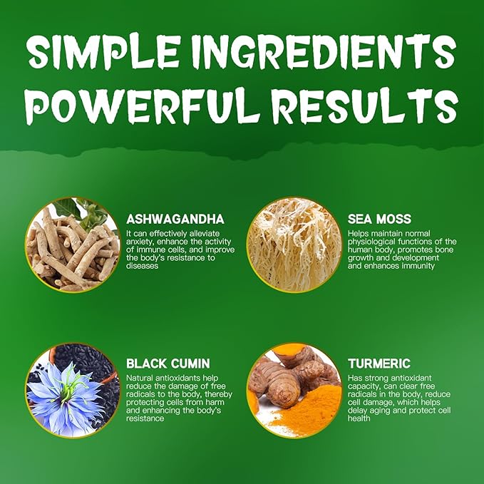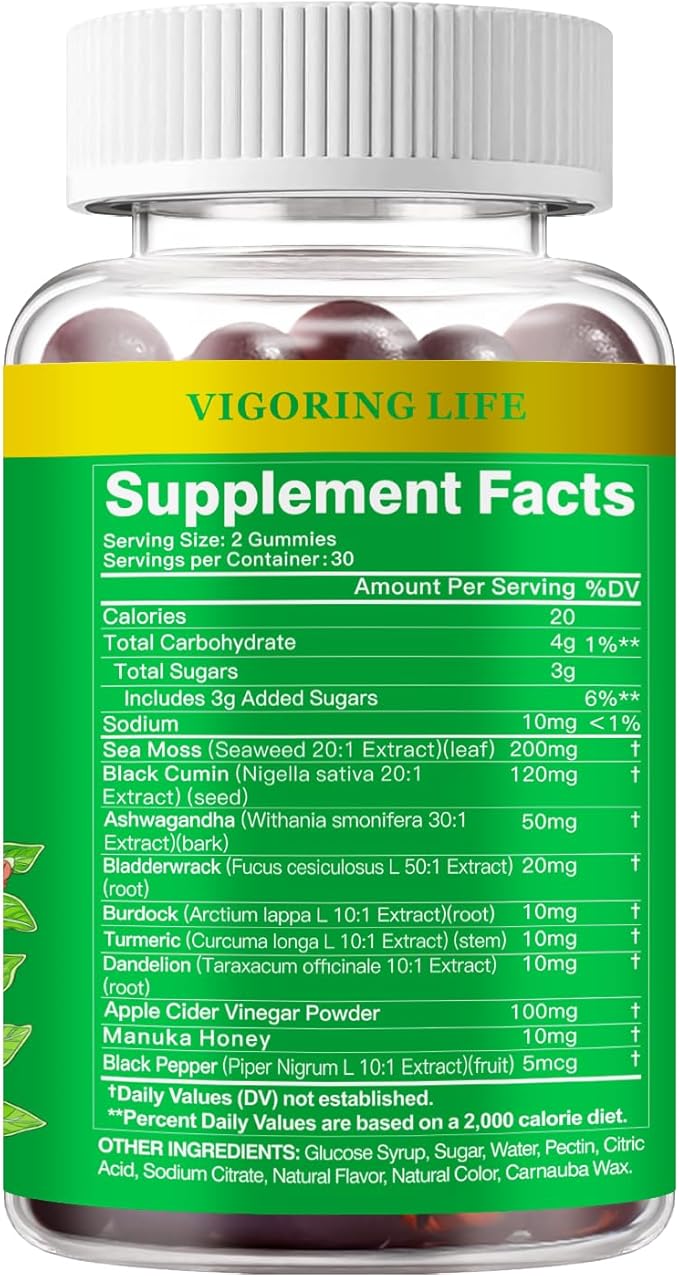 - Premium Formula: Per serving ashwagandha gummies contain organic ashwa bark, combined with sea moss, black seed oil, turmeric, bladderwrack, burdock, dandelion, apple cider vinegar, manuka honey, black pepper for maximal efficacy. Comes with 60 gummies, 30-day supply.