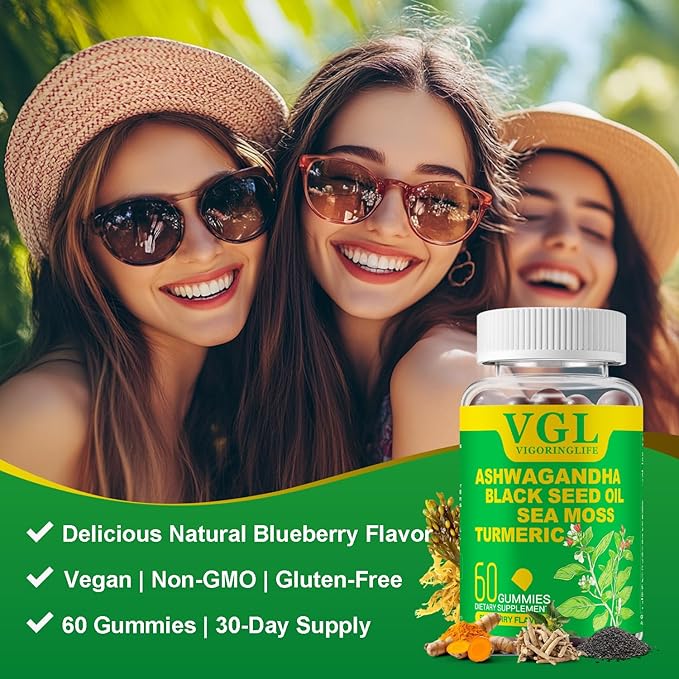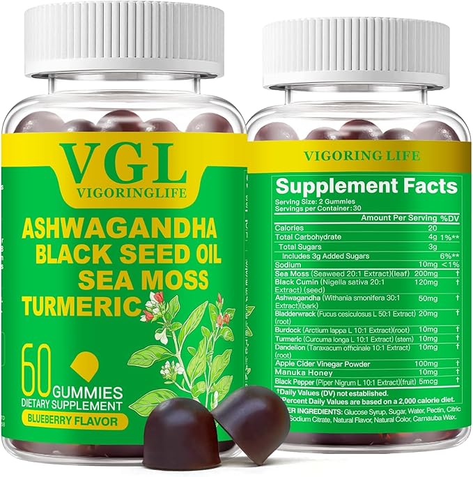 Ashwagandha Gummies, Sea Moss, Black Seed Oil, Turmeric, Manuka Honey, ACV, Dandelion, Black Pepper, Burdock, Bladderwrack, Blueberry Flavor, Vegan, Gluten-Free, Non-GMO, 60 Count