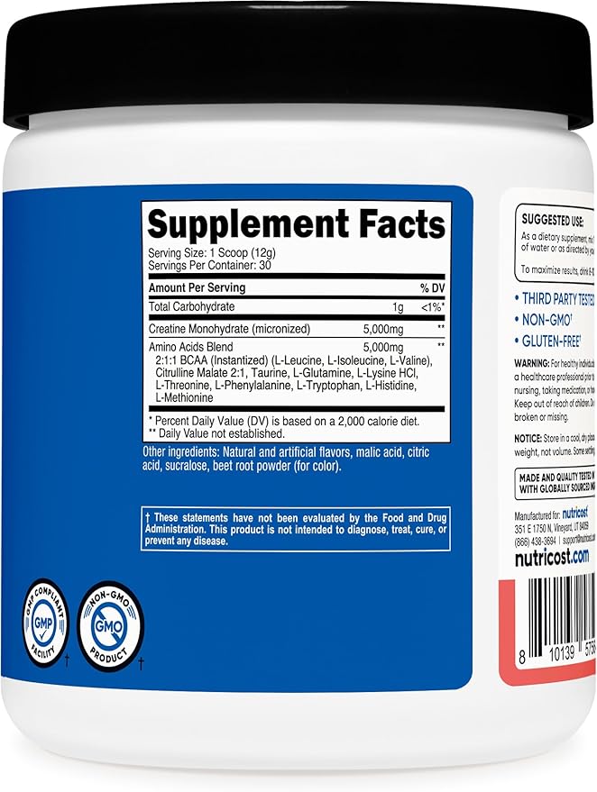 - Nutricost Creatine + Aminos is manufactured in a GMP-compliant facility and third-party tested for quality.