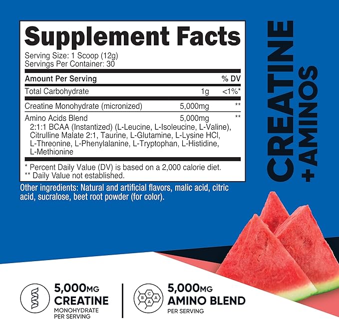 Nutricost Creatine + Aminos 30 Servings (Watermelon Flavored) - 5,000mg Creatine Monohydrate + 5000mg Amino BCAA Blend Per Serving