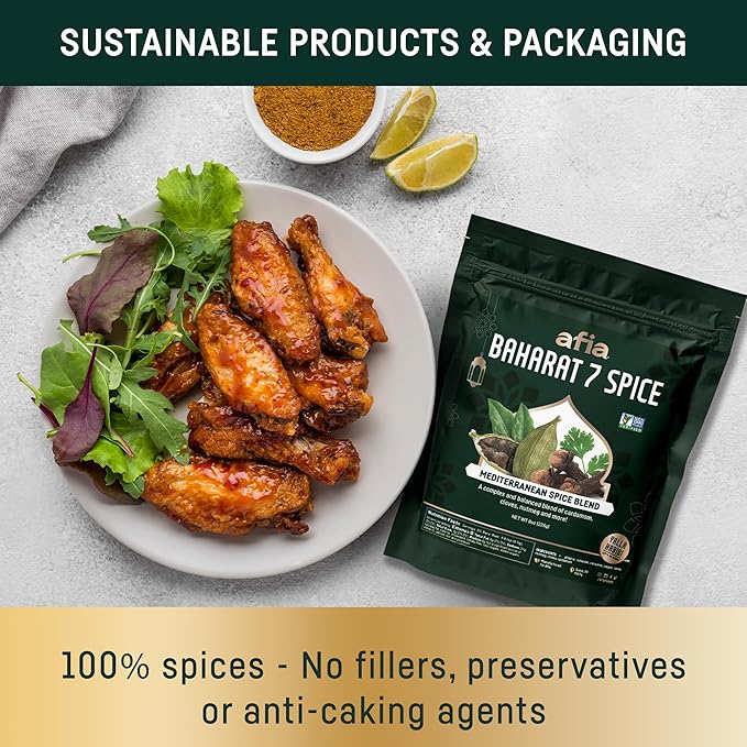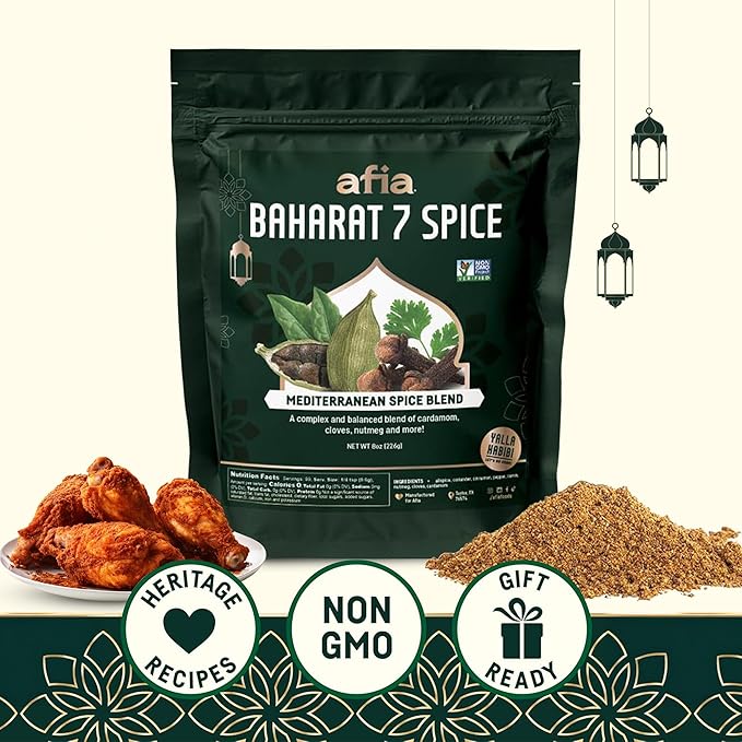 Afia Baharat 7 Spice Blend – Premium Levantine Seasoning with Coriander, Cinnamon, Cloves, Black Pepper, Cumin & Cardamom – Bold Middle Eastern & Mediterranean Flavor for Meats, Rice & Stews, 8 oz