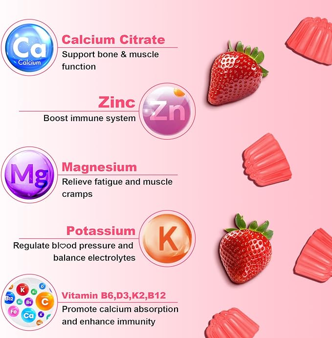 - Enhance Nerve System & immune Function - Calcium Citrate Gummies will nourish your nervous system with essential B vitamins ! Vitamin B6 and B12 optimize neurotransmitter production and nerve signal transmission, while Magnesium calms overstimulated neurons. Plus, adequate calcium intake will enhance immune function,promoting your overall health.