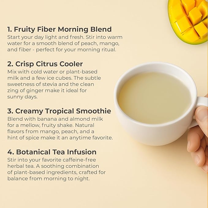 - š Fruity Digestive Blend ā Features a tropical mix of Peach and Mango powders combined with Ginger and Bromelain for a refreshing, balanced experience
