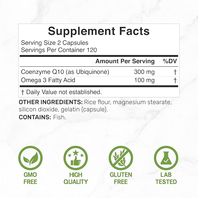 - Dosage & Servings – 2 capsule serving size that offers a 120-day supply. The 300mg CoQ10 with 100mg Omega 3 Fatty Acid dosage allows for efficient delivery of essential nutrients.