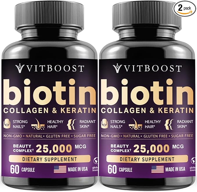 - The Power of Collagen, Keratin & Biotin Complex - Our carefully formulated hair vitamins for thicker hair growth and overall beauty enhancement are crafted to nourish your body from within. Prepare to be amazed by the transformative effects of our biotin supplements, as they stimulate healthy hair growth, enhance skin elasticity, and fortify your nails. Embrace the radiance that comes from nurturing your hair, skin, and nails with Vitboost's exceptional care and dedication.