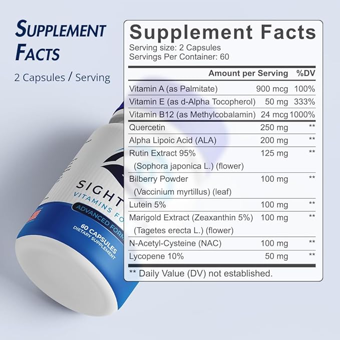 - Primary Supplement Type : Alpha Lipoic Acid (ALA) 200 mg, Quercetin 250 mg, Rutin Extract 95% (Sophora japonica L.) (flower) 125 mg, Bilberry Powder (Vaccinium myrtillus) (leaf)100 mg, Lutein 5%100 mg, Marigold Extract (Zeaxanthin 5%) (Tagetes erecta L.) (flower) 100 mg, N-Acetyl-Cysteine (NAC)100 mg, Lycopene 10% 50 mg, Vitamin A (as Palmitate) 900 mcg 100%, Vitamin E (as d-Alpha Tocopherol) 50 mg 333%, Vitamin B12 (as Methylcobalamin) 24 mcg 1000% Alpha Lipoic Acid (ALA) 200 mg, Quercetin 250 mg, Rutin Extract 95% (Sophora japonica L.) (flower) 125 mg, Bilberry Powder (Vaccinium myrtillus) (leaf)100 mg, Lutein 5%100… See more