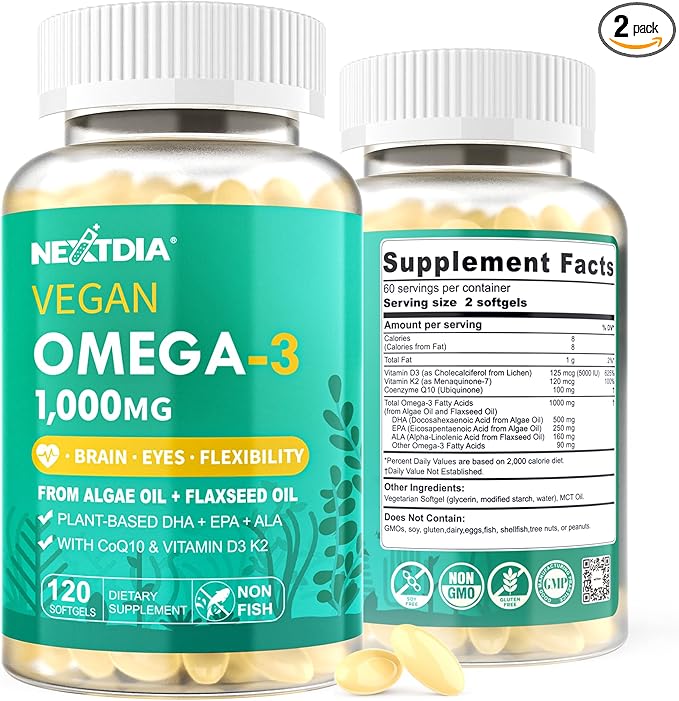 2 Pack Vegan Omega 3 D3 K2 CoQ10 Supplement, Plant Based DHA EPA ALA for Women Men, Omega 3 Organic Algae Flaxseed Oil Supplement for Bone, Brain, Eye & Immune Support, No Carrageenan, 240 Softgels