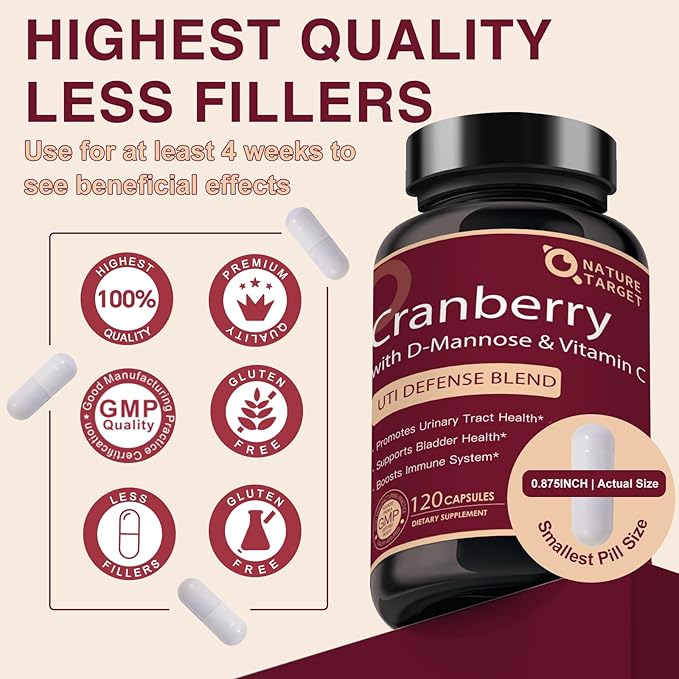 - SAFE, NATURAL, EFFECTIVE - Our cranberry capsules are made with premium vegetarian ingredients, produced in a GMP-certified facility, Non-GMO, soy and gluten, NATURE TARGET Cranberry capsules contain 120 capsules per bottle, each capsule contains super concentrated extract, great value for money.