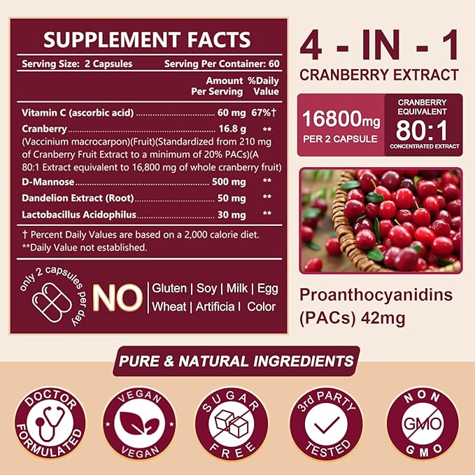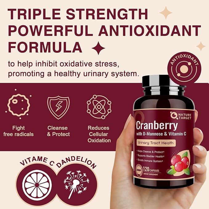 - 4-IN-1 CRANBERRY - NATURE TARGET maximum concentration cranberry extract supports urinary tract and immune health, combining Vitamin C for antioxidant support and D-Mannose to protect against flora that cause UTIs. Also includes Lactobacillus acidophilus and Dandelion Extract for additional support.