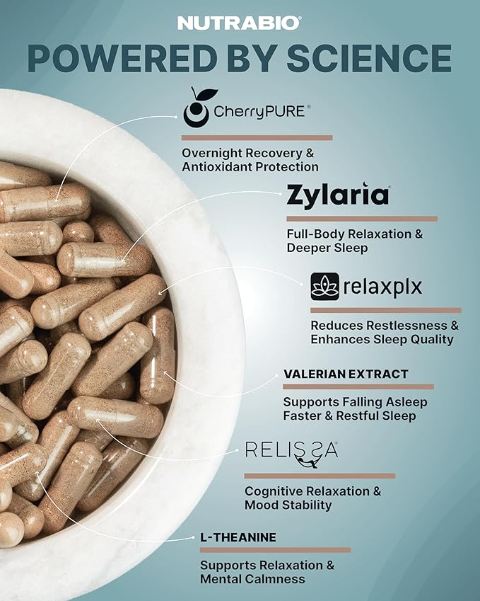 - Natural Sleep & Stress Support: Clinically studied adaptogens like Zylaria and Relissa help calm the mind, ease anxious feelings, and promote a balanced mood. NutraBio Sleep supports more than just rest—it helps manage stress and encourages a sense of calm both day and night.
