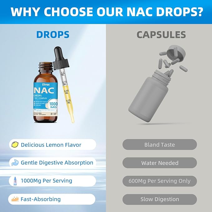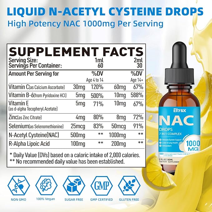 - Our nac drops also along with additional vitamins, including Vitamin C, Vitamin E, and Zinc, which work together to enhance antioxidant levels, support skin & brain health, and keep overall health