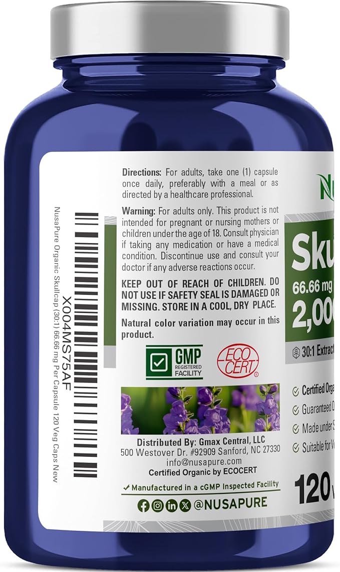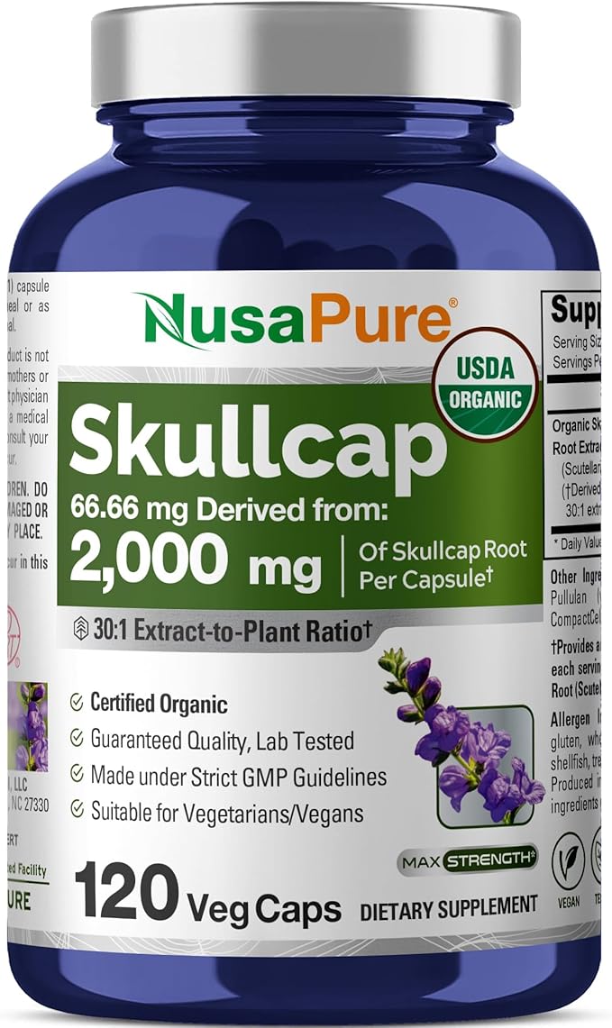 NusaPure Organic Skullcap Root 30:1 Extract, 66.66 mg Equivalent to 2,000mg Per Veggie Caps 120 Count (Non-GMO, Vegan)