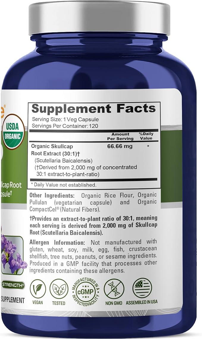- Contains 66.66 mg of Organic Skullcap Root Extract (Scutellaria Baicalensis) with a 30:1 extract-to-plant ratio, derived from 2,000 mg of raw herb