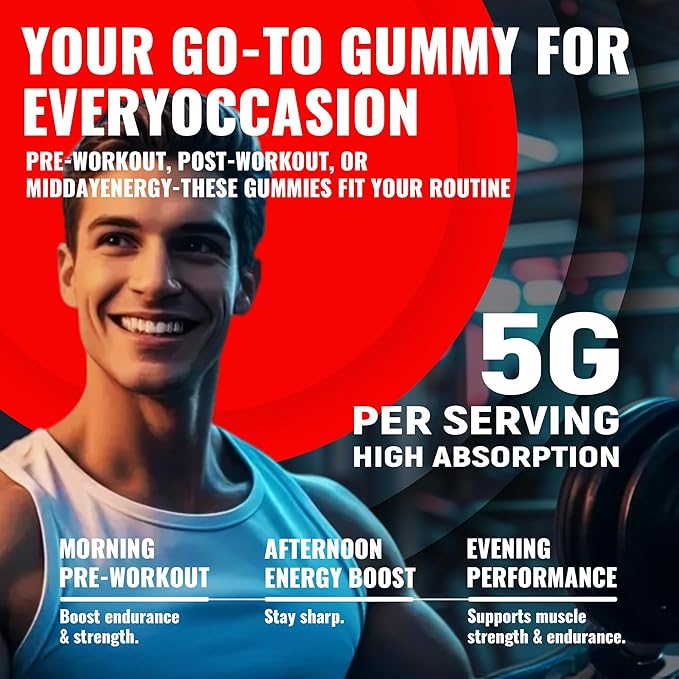 - [ Key Benefits]: Our Creatine monohydrate gummies are an easy way to consume, 3 gummies per serving, you can take it at any time, any place. It improved muscle strength, muscle recovery, improve endurance and energy boost. Suitable for a variety of users, and enjoyable taste.