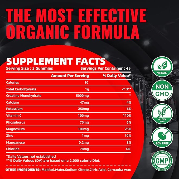 - [Vegan, Gelatin Free, Sugar free]: Each bottle contains 135 count vegan, non-GMO & gluten-free, sugar free creatine monohydrate gummies. Super delicious.