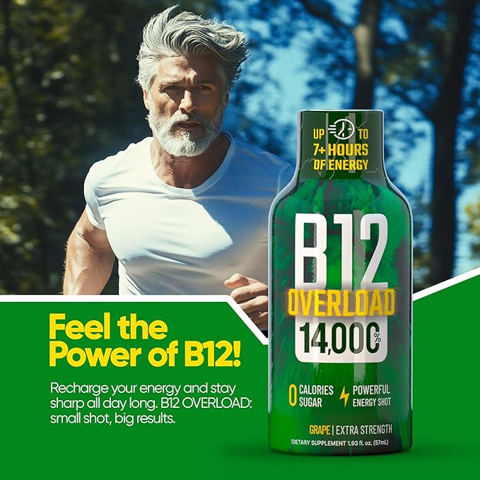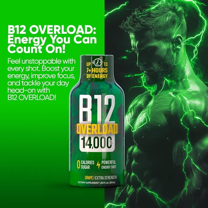 B12 Overload Extra Strength Energy Shot – Grape – 260mg Caffeine, 14000% B12, Electrolytes – Energy & Vitality Support – Zero Sugar No Calories – Vegan, Kosher, Gluten-Free – 1.93 fl oz, 8-Pack