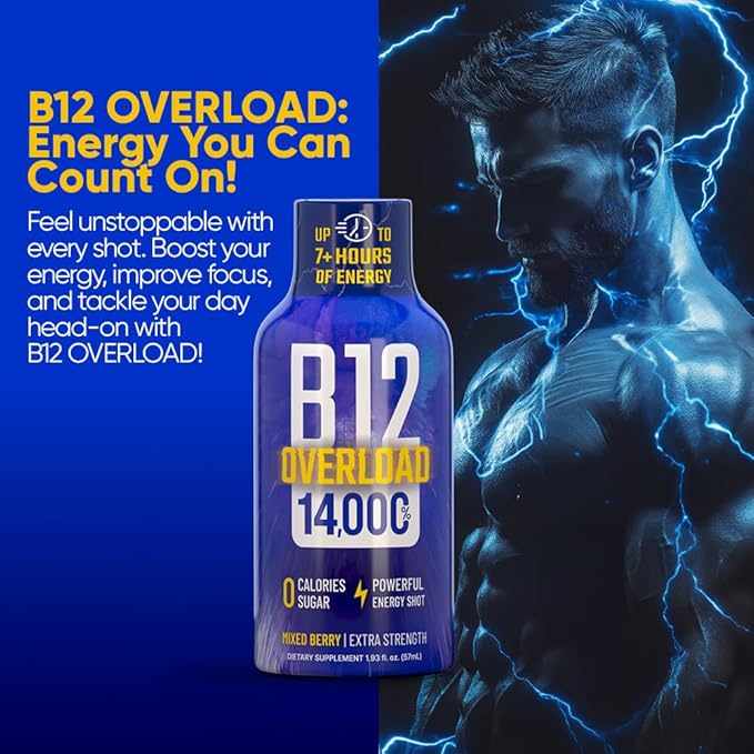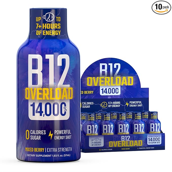 B12 Overload Extra Strength Energy Shot – Mixed Berry – 260mg Caffeine, 14000% B12, Electrolytes – Energy & Vitality Support – Zero Sugar No Calories – Vegan, Kosher, Gluten-Free – 1.93 fl oz, 10-Pack