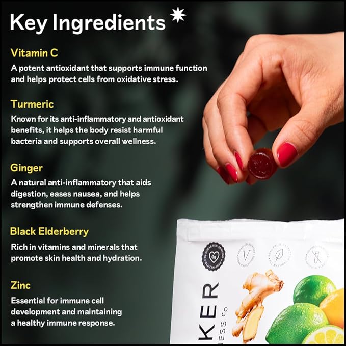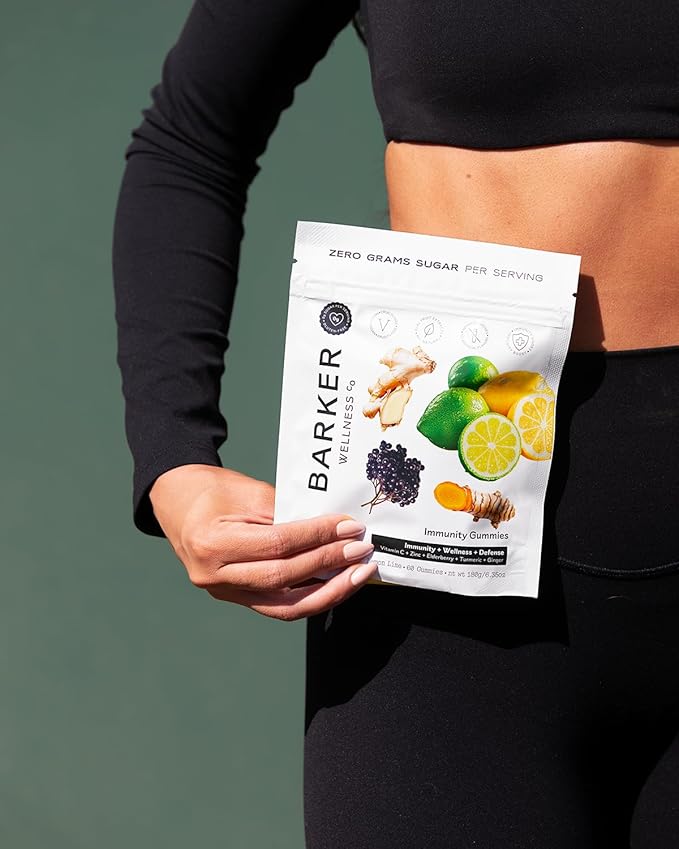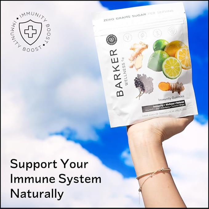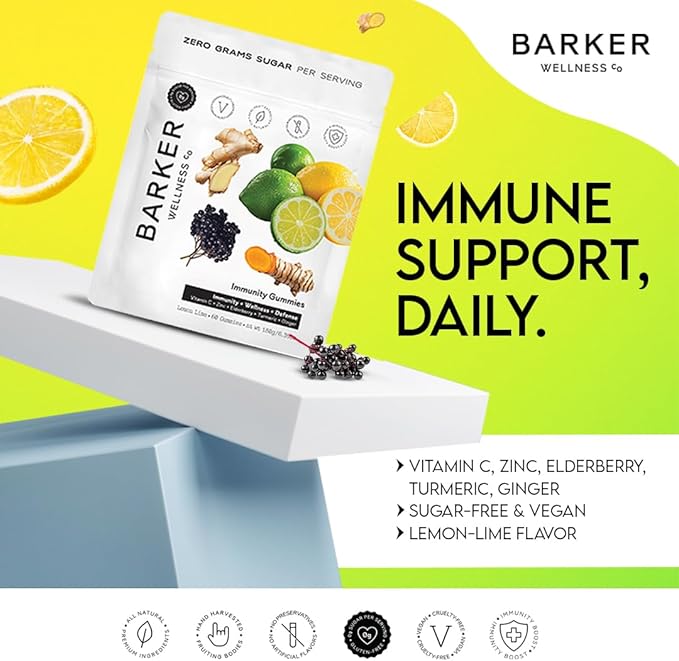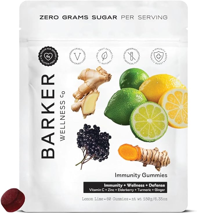 Barker Wellness Immunity Gummies | Vitamin C, Zinc, Elderberry, Turmeric & Ginger | Immune Support | Vegan, Sugar-Free | Lemon Lime Flavor | 60 Gummies