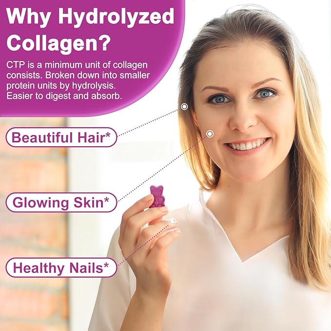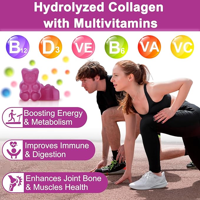 - 【Joint & Bone Health & Immune】Collagen protein gummies include all 5 types of collagen hydrolysate I, Il, Ill, V & X and Multvitamins for maximum effectiveness, which is associated with an improvement in skin, hair & nails, muscles health for men and women.Rejuvenate your body to promote energy metabolism and improve immune & digestive system,by quickly supporting comfortable joints and strengthening bones. Gummy form,making it a one-stop nutritional supplement for your collagen needs!