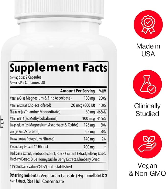 - UNIQUE NOXA24 BLEND — Contains 700 mg of Black Garlic Extract, Beetroot Extract, Black Currant Extract, Bilberry Extract, Raspberry Extract, Blue Honeysuckle Berry Extract, and Blueberry Extract for unrivalled results