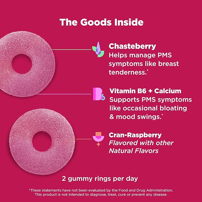 - THE GOODS INSIDE: Chasteberry, a plant extract, helps manage symptoms like breast tenderness, so you can get the weight of worrying about PMS off your chest—literally. Calcium support PMS symptoms like occasional bloating & mood swings for fewer ups and downs*