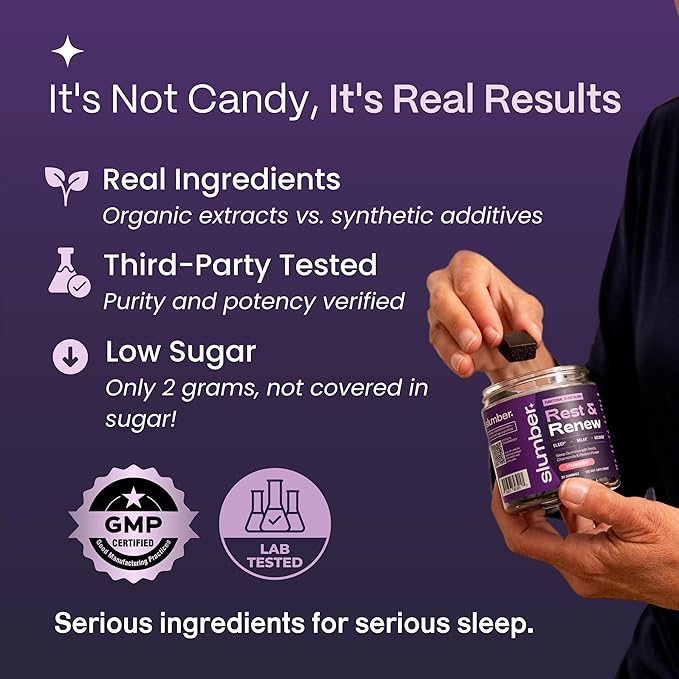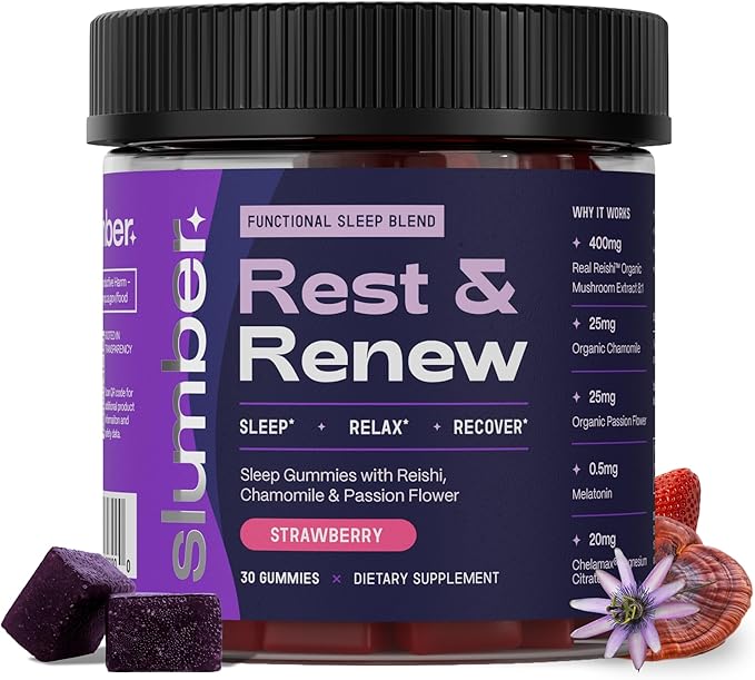 Slumber Rest & Renew Sleep Gummies, Vegan Sleep Aid With Organic Passion Flower, Chamomile, & Pure Reishi Mushroom to Support Relaxation Before Bed, Plant Based, Low Sugar, Strawberry Flavor, 30 Count