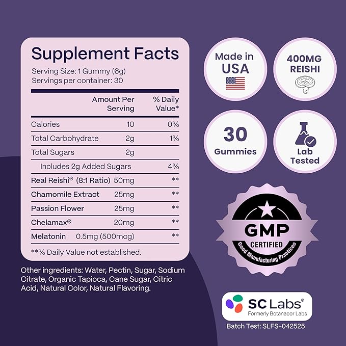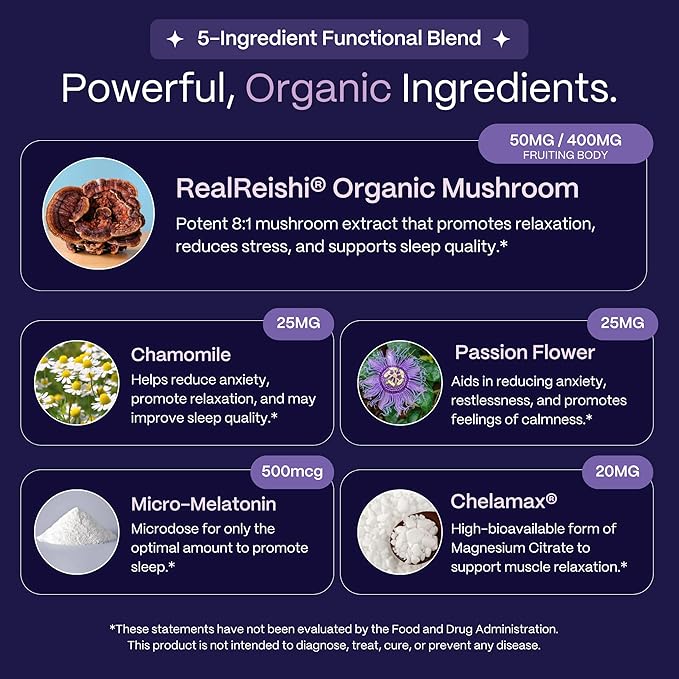 - POWERFUL BOTANICAL BLEND: Crafted with organic, real Reishi mushrooms, chamomile, and passion flower, this sleep blend promotes relaxation and a restful sleep experience. Reishi mushrooms support sleep quality, chamomile can help quiet your mind, and passion flower works to reduce restlessness, making this a complete solution for achieving deep, uninterrupted sleep.