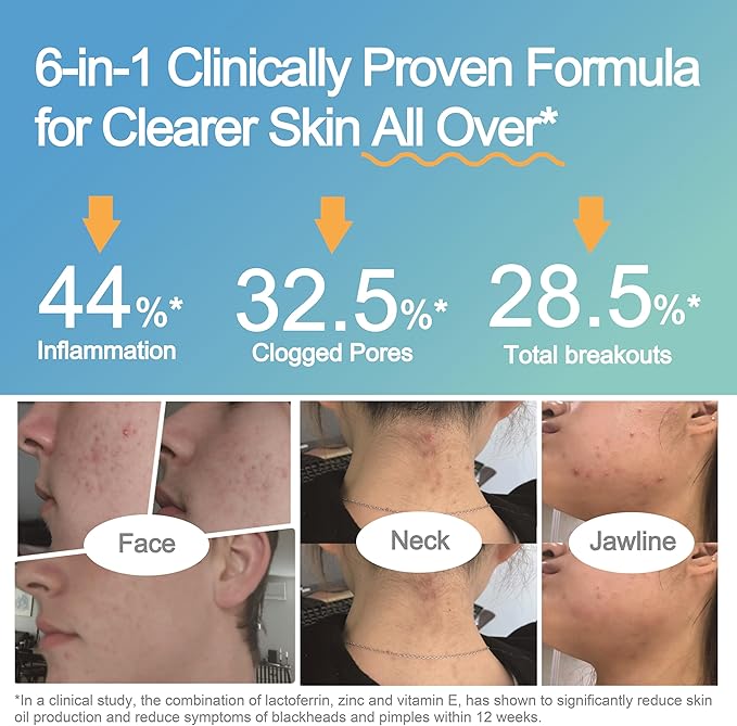 - CLINICALLY PROVEN ACNE RELIEF: TARGETS BREAKOUTS AT THE SOURCE - Our unique formula blends clinically tested lactoferrin, zinc, and vitamin E to combat breakouts and pimples. These powerhouse ingredients work synergistically to reduce excess pore-clogging sebum, unclog impurities, and visibly clear blackheads, whiteheads, and stubborn breakouts—delivering effective acne treatment for face, body, jawline and neck, all backed by rigorous research.