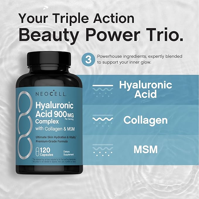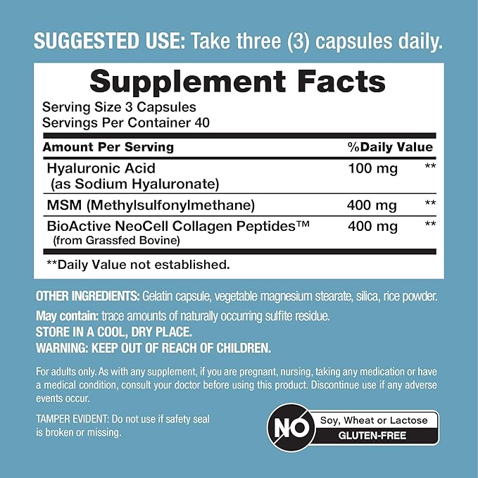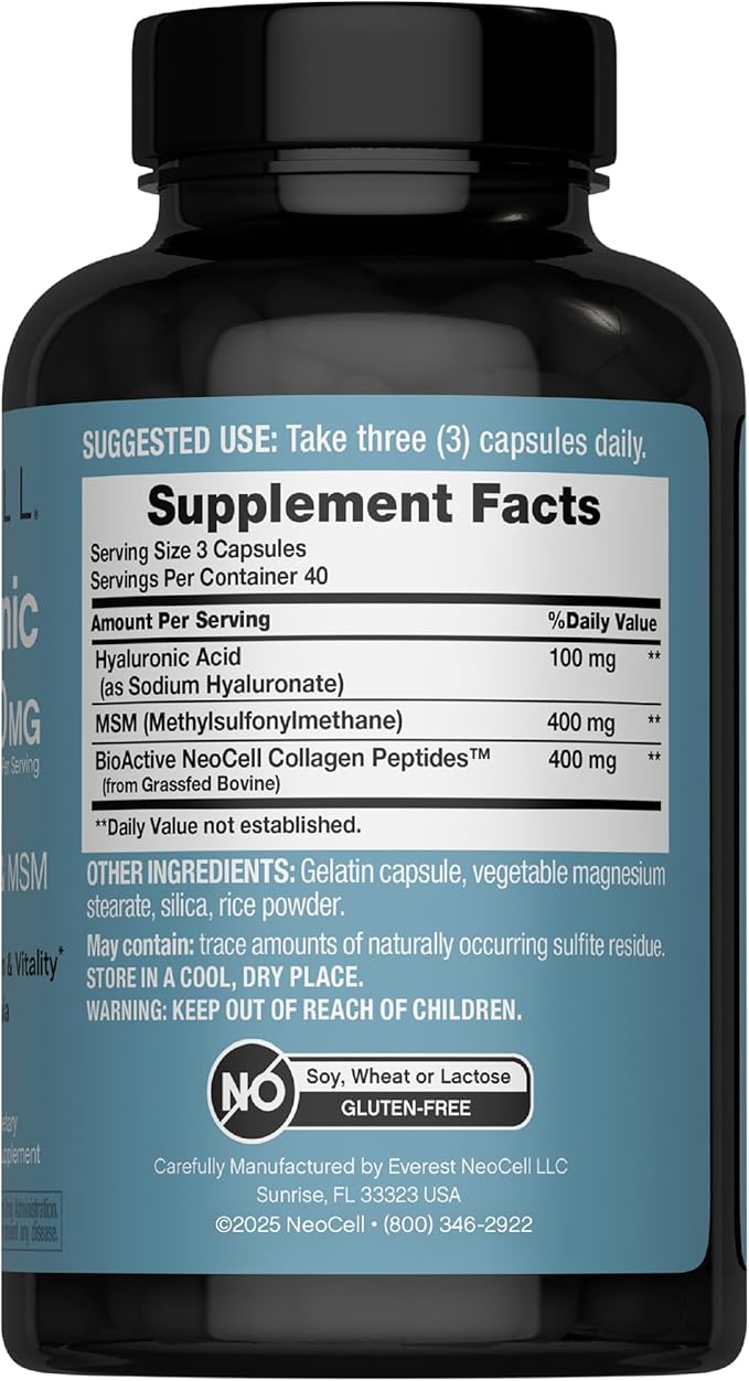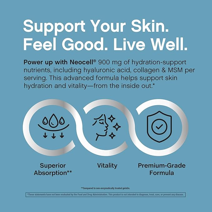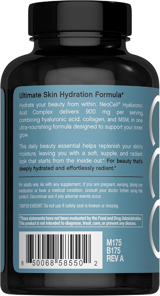 - Ultimate Skin Hydration*: At the heart of vibrant, supple skin lies 3 powerful ingredients: hyaluronic acid, collagen, and MSM.* Each serving delivers 900 mg of NeoCell Hyaluronic Acid Complex.