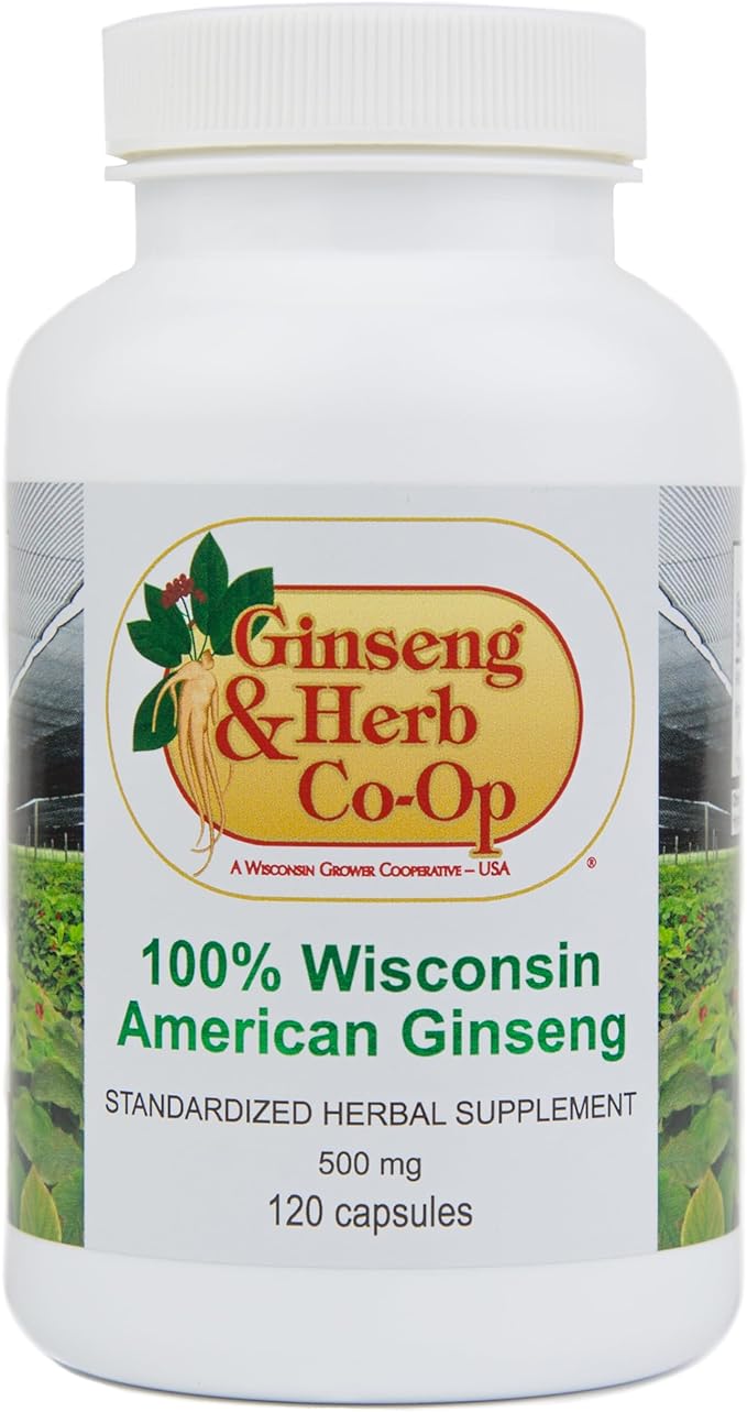 100% Pure Wisconsin American Ginseng Capsules - 500mg. Authentic Panax Quinquefolius. Potent Ground Ginseng Root - No Fillers, Binders or Other Additives. (120 Count)