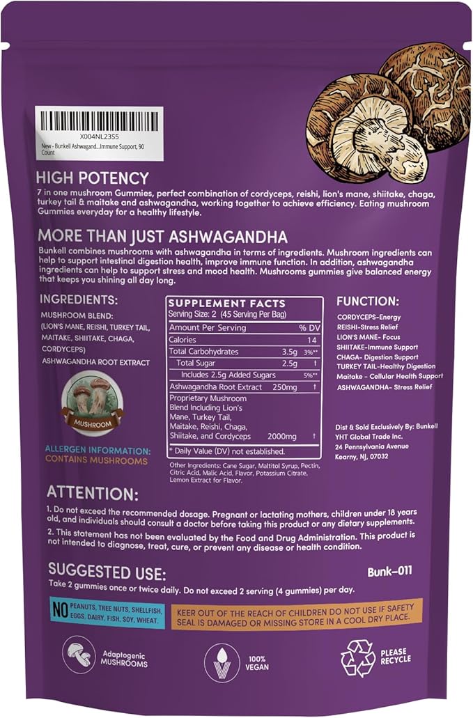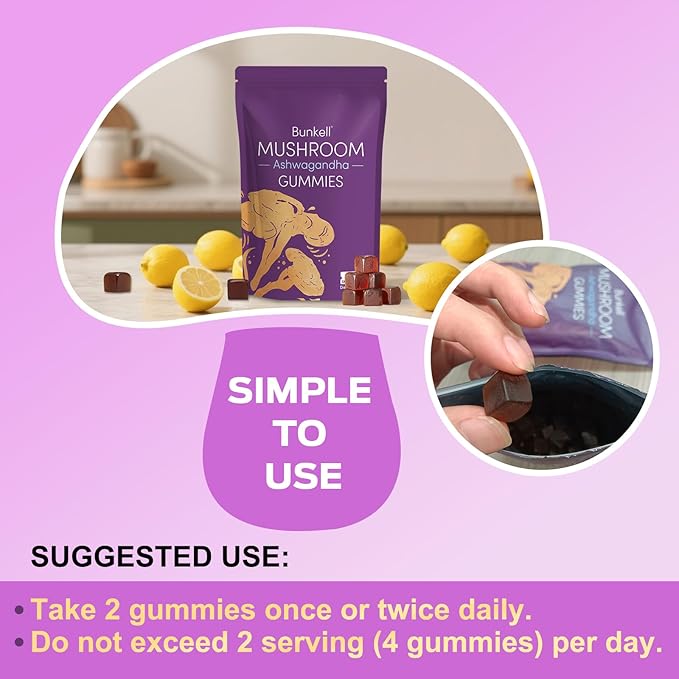 - Safety & Healthy: Bunkell mushroom supplement gummy is Non-GMO and gluten-free. Adaptogenic mushroom ingredients are suitable for vegan diets and plant-based preferences. For best results, take 2 gummies once or twice daily,. Do not exceed 2 serving (4 gummies) per day. 45 Day Supply to support a healthy lifestyle.