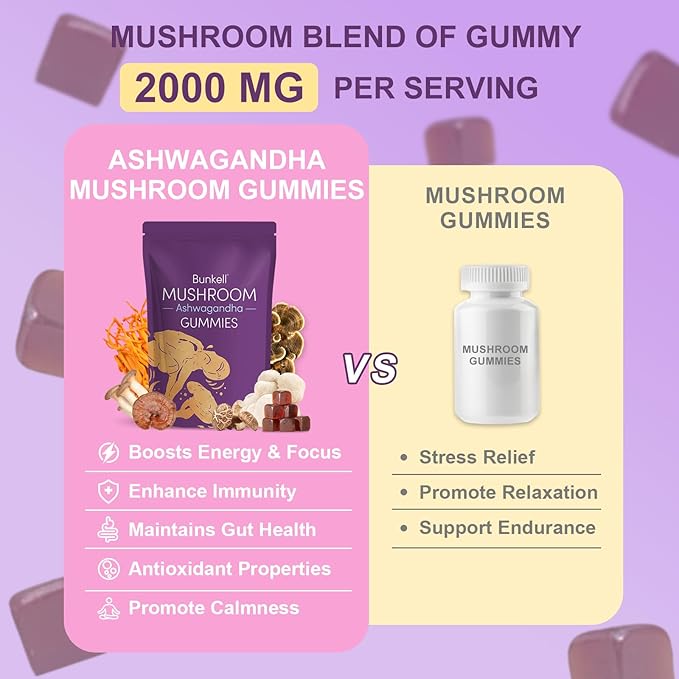 - Enhance Immunity: Mushrooms contain compounds called polyphenols, and ashwagandha is rich in flavonoids, because of their antioxidant properties, ashwagandha & mushroom gummy can help strengthen one's immune health, block the damage caused by free radicals to us.