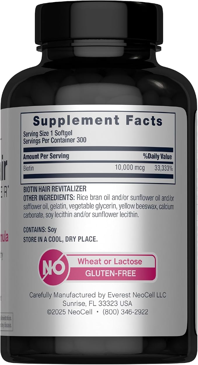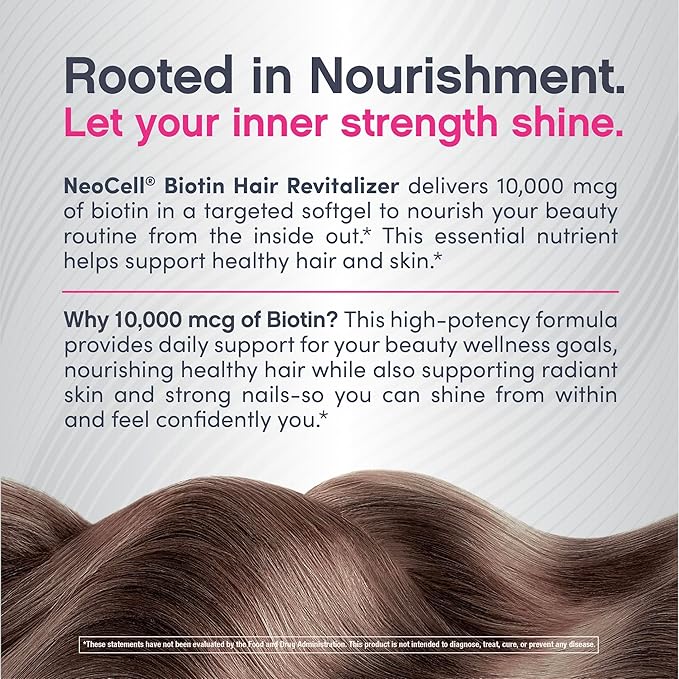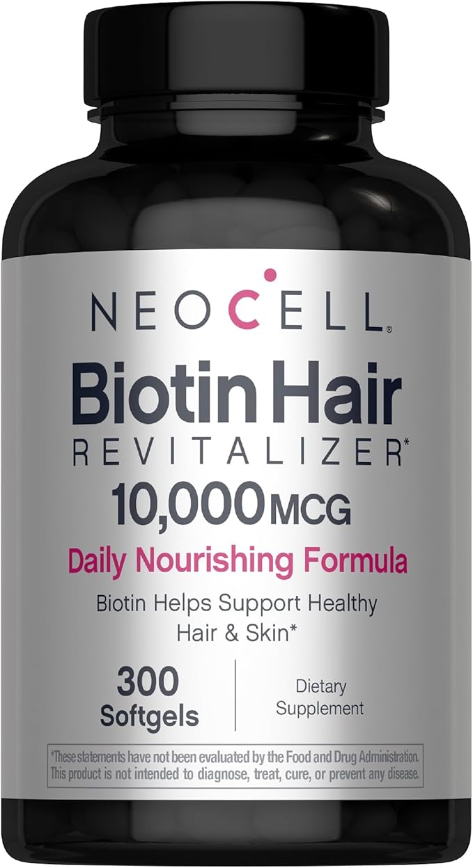 - Biotin Hair Revitalizer*: Start your day with a beauty ritual that goes beyond the surface. NeoCell’s Biotin Hair Revitalizer softgels deliver 10,000 mcg of biotin in a targeted formula designed to nourish healthy hair from root to shine.*