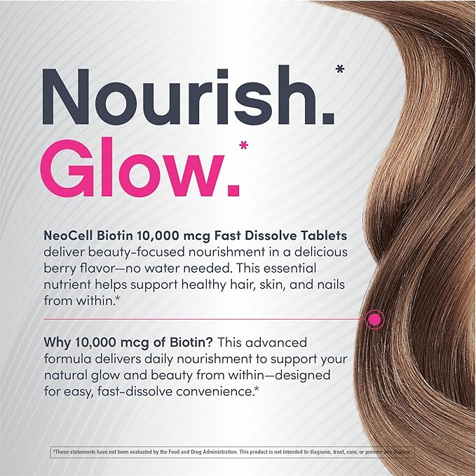 - Fast Dissolve Biotin: Imagine starting your day with a burst of berry flavor that dissolves effortlessly on your tongue—NeoCell’s Biotin 10,000 mcg fast dissolve tablet transforms your beauty routine into a moment of ease and indulgence.