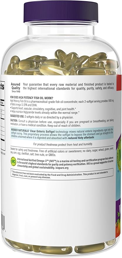 - NO FISHY AFTERTASTE: Our clear enteric softgel technology enhances absorption and prevents fishy aftertaste. Webber Naturals Fish Oil is ultra-purified and tested to meet strict purity standards