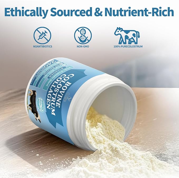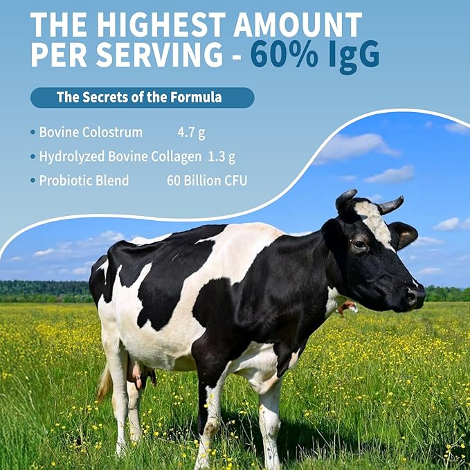 - Premium Grass-Fed Colostrum - Our colostrum is sourced from pasture-raised cows, with raw materials carefully selected from around the globe to ensure freedom from pesticide residues and contaminated forage. It contains no GMOs, gluten, artificial additives, fillers, or harmful chemicals. Bovine colostrum is a superfood, rich in growth factors*, essential amino acids, proteins, and IgG—key components for healthy development. We prioritize calf nutrition, ensuring calves are nourished before colostrum is collected