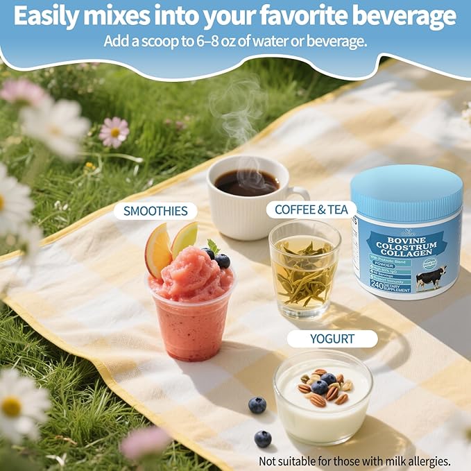 - Made in the USA, this 40-day supply of colostrum powder is easy to mix and incorporate into your routine. Simply add 1 scoop to 6–8 oz of water or a non-carbonated beverage. For children aged 1–10, use half a scoop. Not recommended for those with milk allergies