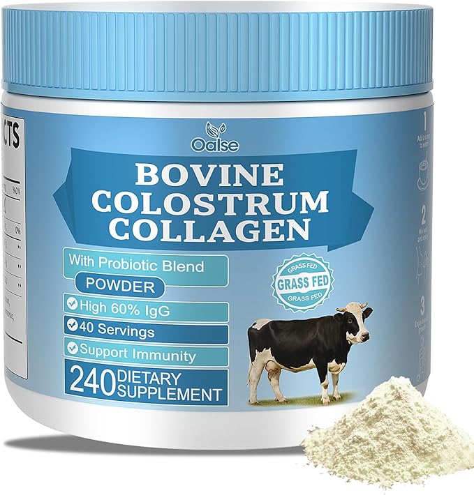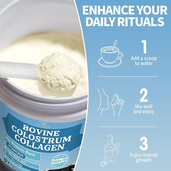 - 60% IgG - OALSE bovine colostrum contains a premium 60% IgG concentration, trusted to support immune system function. We also add hydrolyzed bovine collagen to ease digestive discomfort while enhancing collagen absorption efficiency. This helps strengthen nails, hair, and skin, improving elasticity and radiance